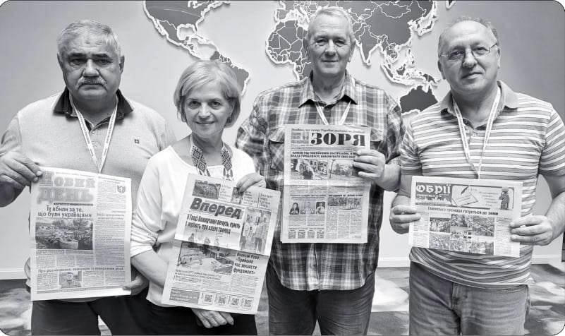 In the photo, from left to right: Anatolii Zhupyna (Novyi Den, Kherson), Svitlana Ovcharenko (Vpered, Bakhmut), Oleksandr Pasichnyk (Zorya, Lyman), and Kostiantyn Hryhorenko (Obrii Iziumshchyny, Izium).