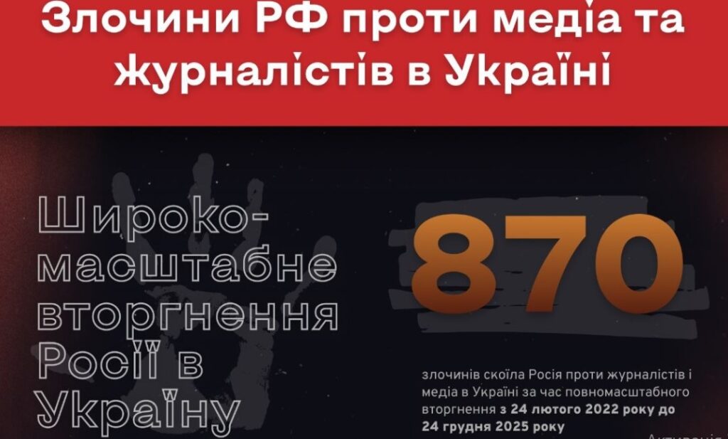 Since the beginning of the full-scale invasion of Ukraine – and that is 3 years and 10 months – russia has committed 870 crimes against journalists and media. In particular, two crimes against the media and journalists committed by russia were recorded in November and December. These were cases of damage to media newsrooms and judicial pressure on Ukrainian journalists detained by russia.